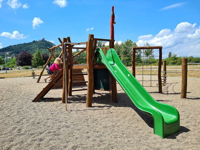 Menší dětské hřiště s několika herními prvky