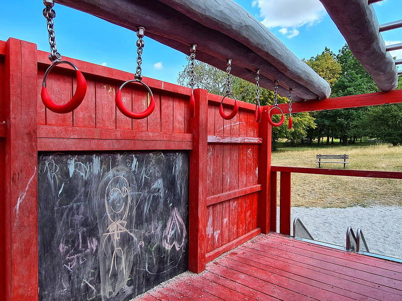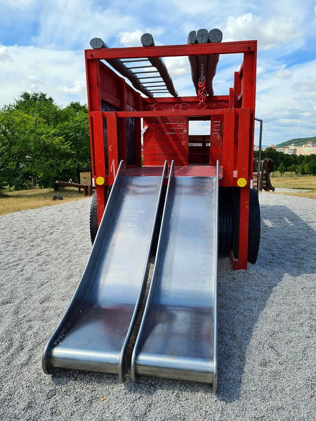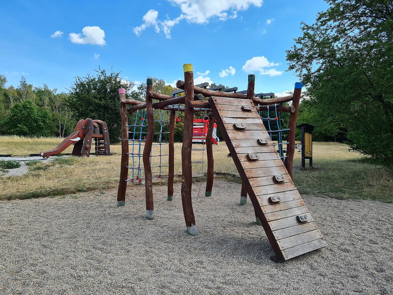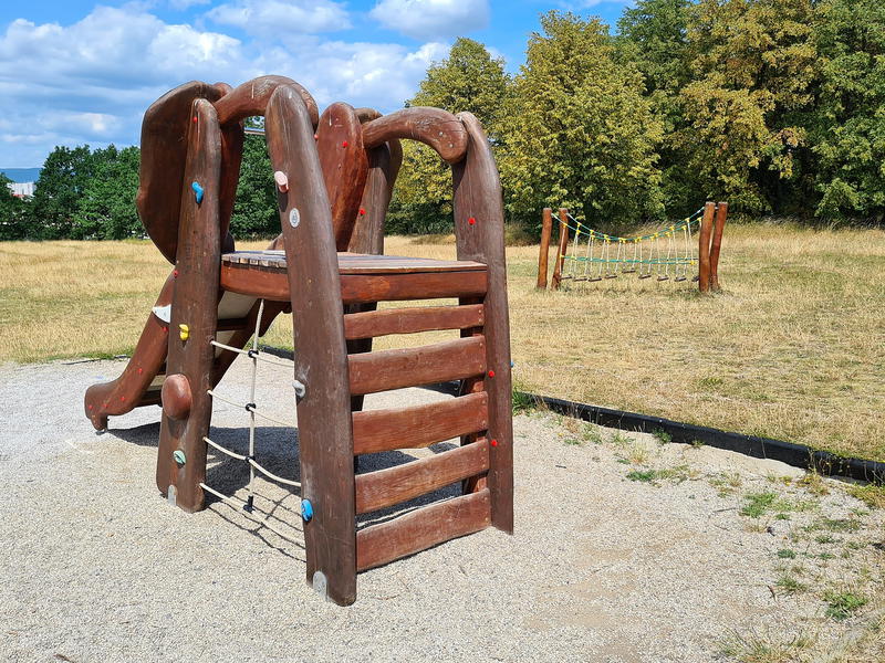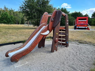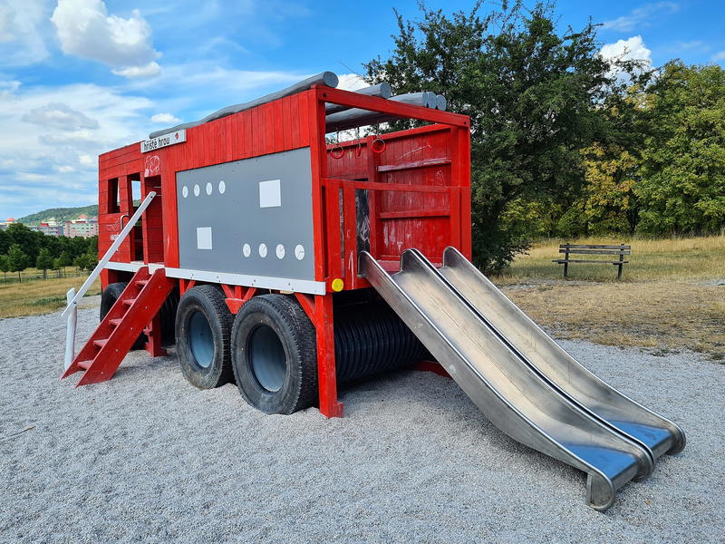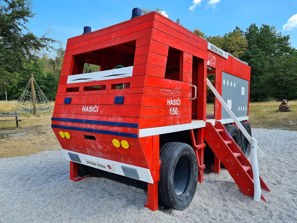 Krásné dětské hřiště s dřevěnými prvky včetně hasičského auta