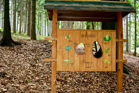 Zážitkovou stezku "Hravé putování ještědským lesem" zvládnete projít i s malými dětmi, vede převážně z mírného kopce. Pokud není sníh, je sjízdná i s kočárkem.