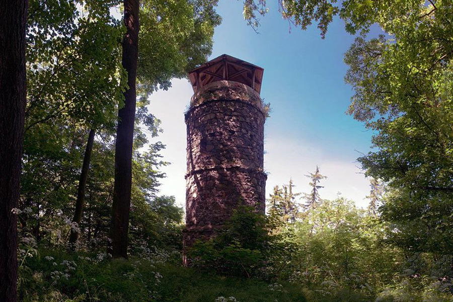 Desetimetrovou kamennou stavbu zde v roce 1880 nechal vybudovat místní rodák a slavný podnikatel Jindřich Mattoni. Kamenná válcová rozhledna dosahuje celkové výšky 13 m. Na zastřešený vyhlídkový ochoz, ve výšce 10 m vede schodiště s 62 kamennými stupni. Z vyhlídkové plošiny nabízí vzrostlými stromy částečně omezený výhled do údolí řeky Ohře s obcemi Kyselka a Radošov.