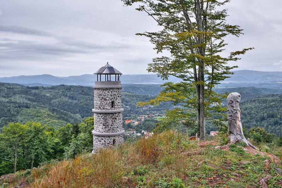 Na rozhlednu vystoupáte z centra obce Kyselka kolem zchátralých...