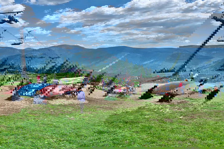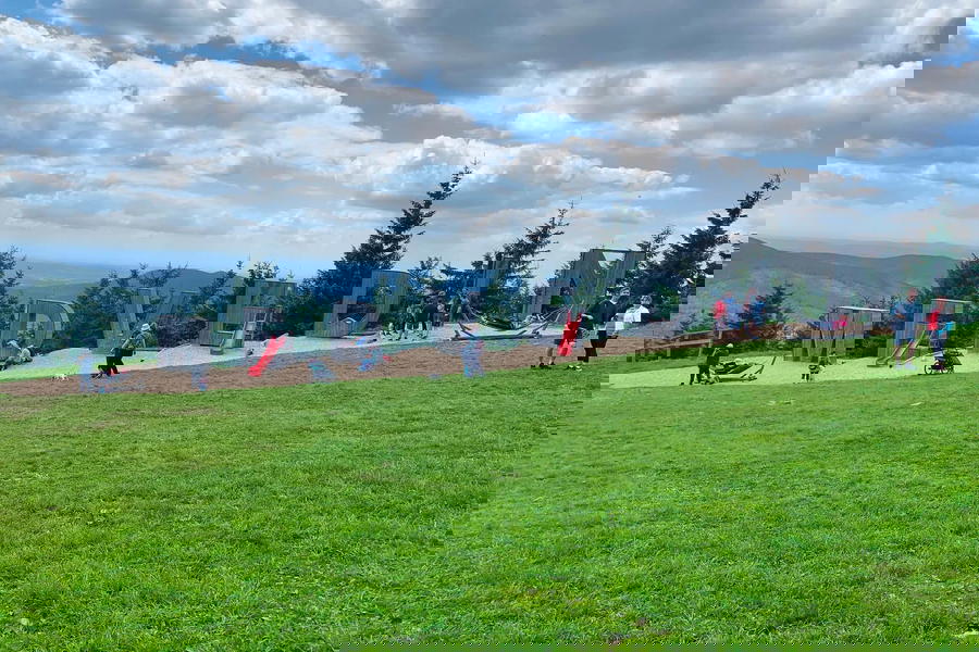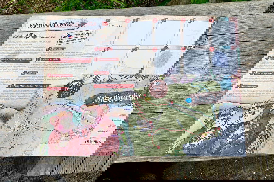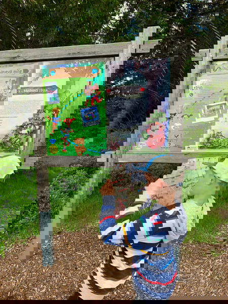Pohodová stezka pro celou rodinu začíná u horní stanice lanové dráhy Medvědín. Při nákupu jízdenek si v kase vyzvedněte mapku s úkoly a vzhůru za medvědy. Jen pozor, ať se děti nevyčerpají ještě před první tabulí, u horní stanice lanovky je totiž parádní dětské hřiště.