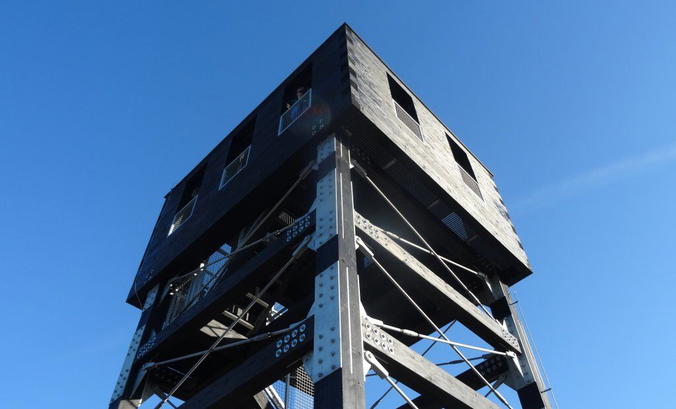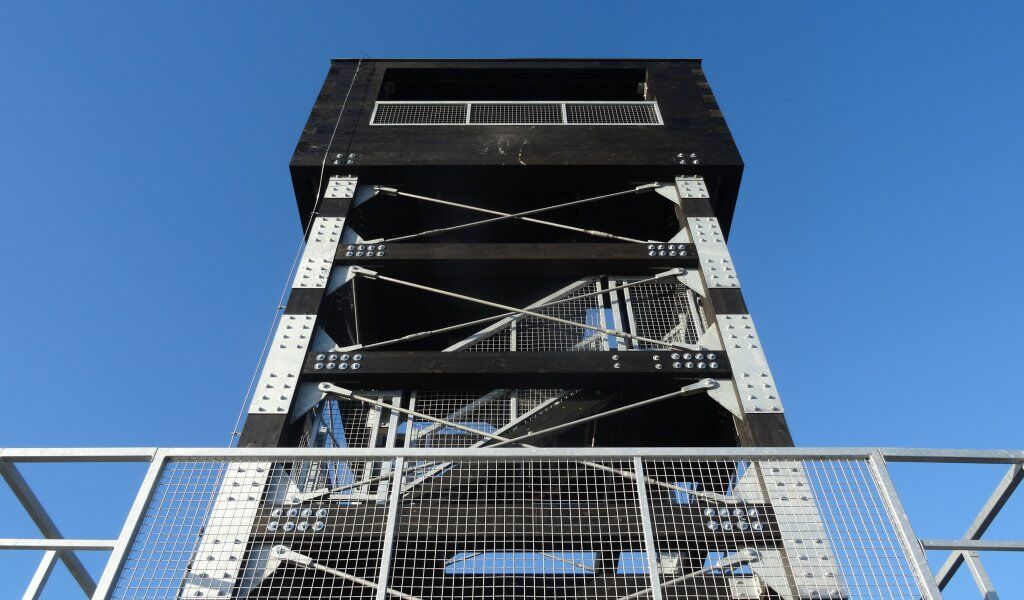 Veselská rozhledna je futuristickou stavbou z černě mořeného dubového dřeva v kombinaci s ocelovými výztužemi.
