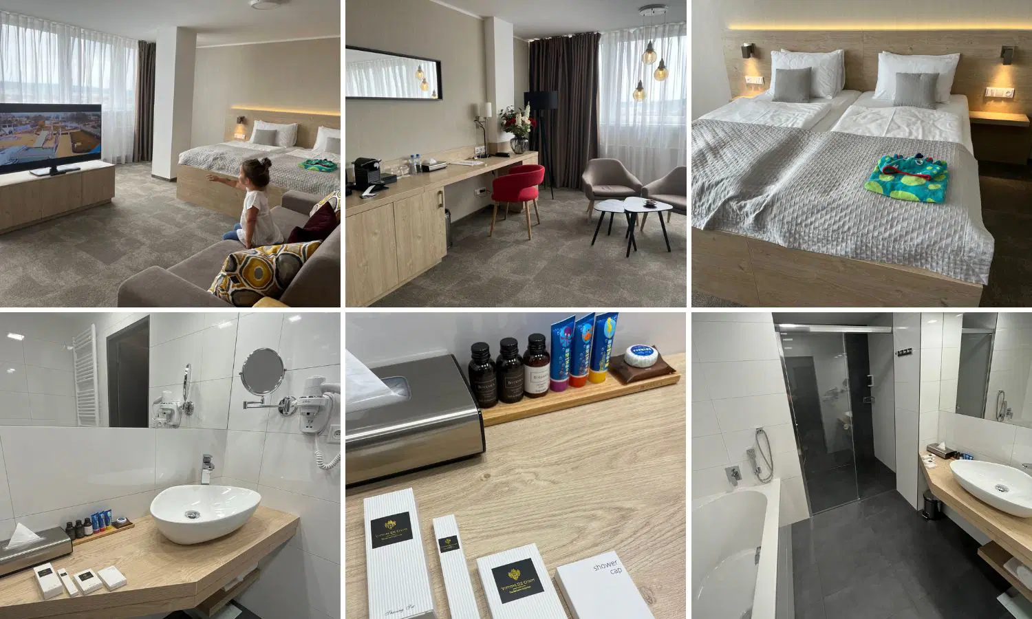 V hotelu si můžete vybrat z jedno nebo dvoulůžkových pokojů, z rodinných pokojů a apartmánů. Pro malé děti vám rádi půjčí postýlku, nočník i stupátko. My dostali prostorný apartmán v 10. patře s božským výhledem na pohádkový Jičín. V koupelně nechyběla dětská kosmetika a dinosauří osuška, ze které měla dcera největší radost.