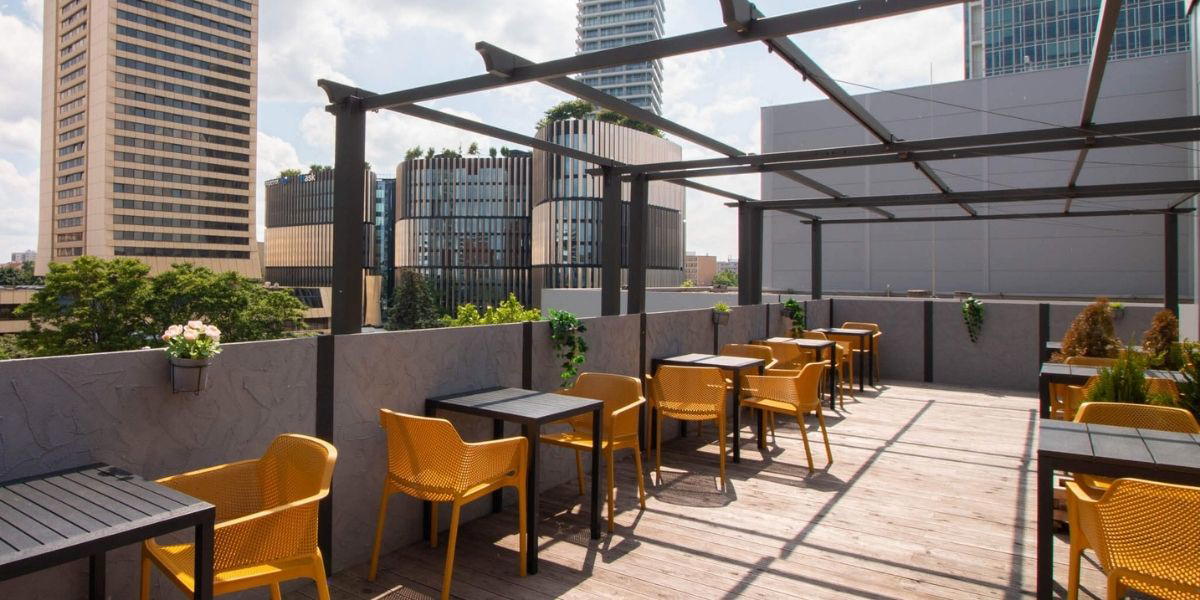 K bistru patří i venkovní terasa a z ní vedou schody na střechu s hřištěm plným trapolín.