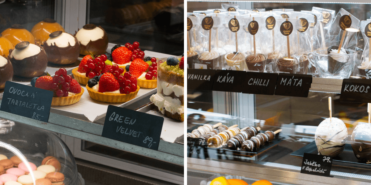 A pak už vyjdete v kavárně, kde na vás budou čekat vaše ztuhlé a krásně zabalené čokoládové výtvory. A taky vitríny plné dortíků, čokoládové palačinky, vafle, horká čokoláda či ovocné špízy v čokoládě. Podaří se vám odolat?