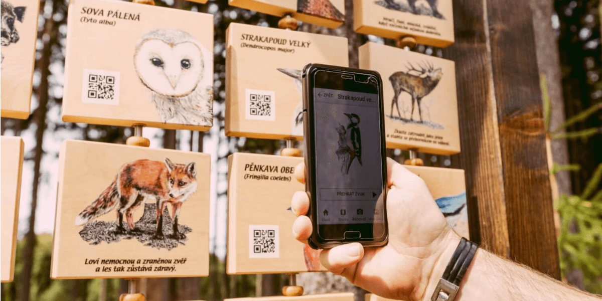 Na jednotlivých panelech najdete QR kódy, které fungují s bezplatnou mobilní aplikací Lesní svět. Ke stažení je k dispozici v Google Play i App Store. Najdete v ní seznam všech stezek Lesního světa a jejich popis, čtečku QR kódů a vaše uložené načtené kódy, takže si na stezce "nalovíte" svoji sbírku zvířat a jejich zvuků.