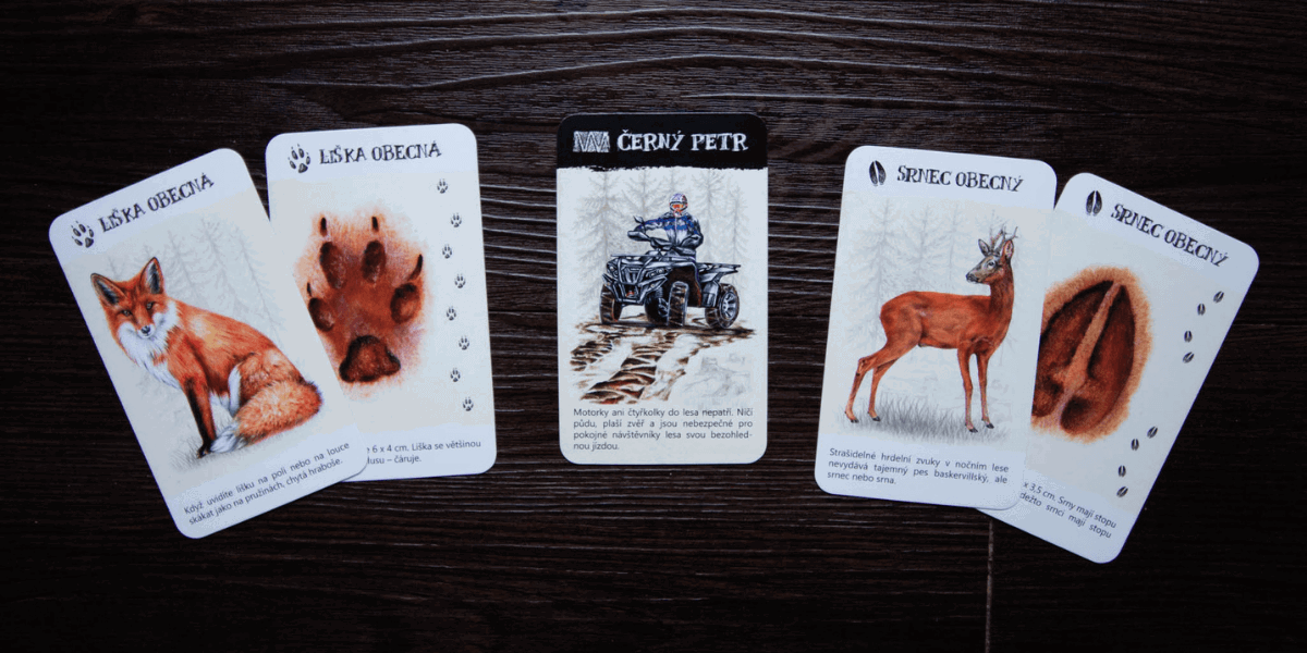 U varianty se stopami hledáte dvojice zvíře - stopa a Černým Petrem je tu čtyřkolka v lese.