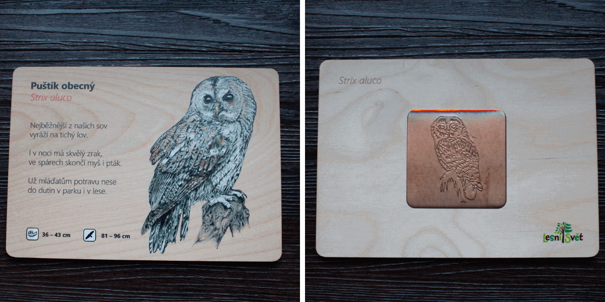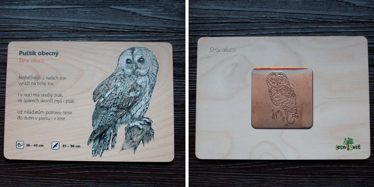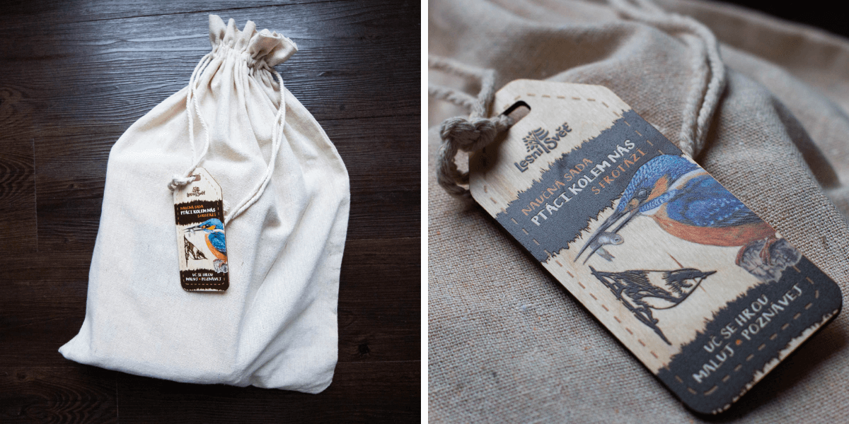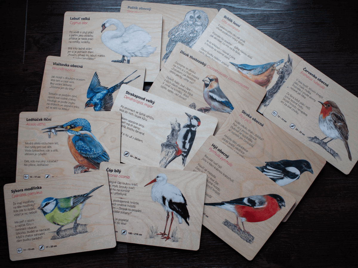Uvnitř najdete 12 dřevěných destiček na každé realistický obrázek ptáka, jeho základní míry, krátkou básničku, frotáž a QR kód pro další informace. Provedení je velmi bytelné, takže se sady perfektně hodí třeba do školy, skautské klubovny či přírodovědného kroužku.