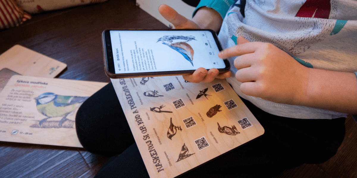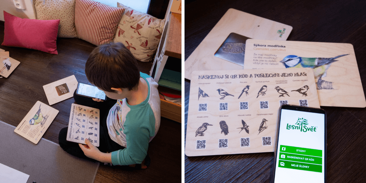 Perfektní je propojení s bezplatnou mobilní aplikací Lesní svět, kterou si můžete stáhnout v Google Play i App Store. Po načtení QR kódu si zobrazíte podrobné informace o jednotlivých ptácích a také si poslechnete jejich zpěv.