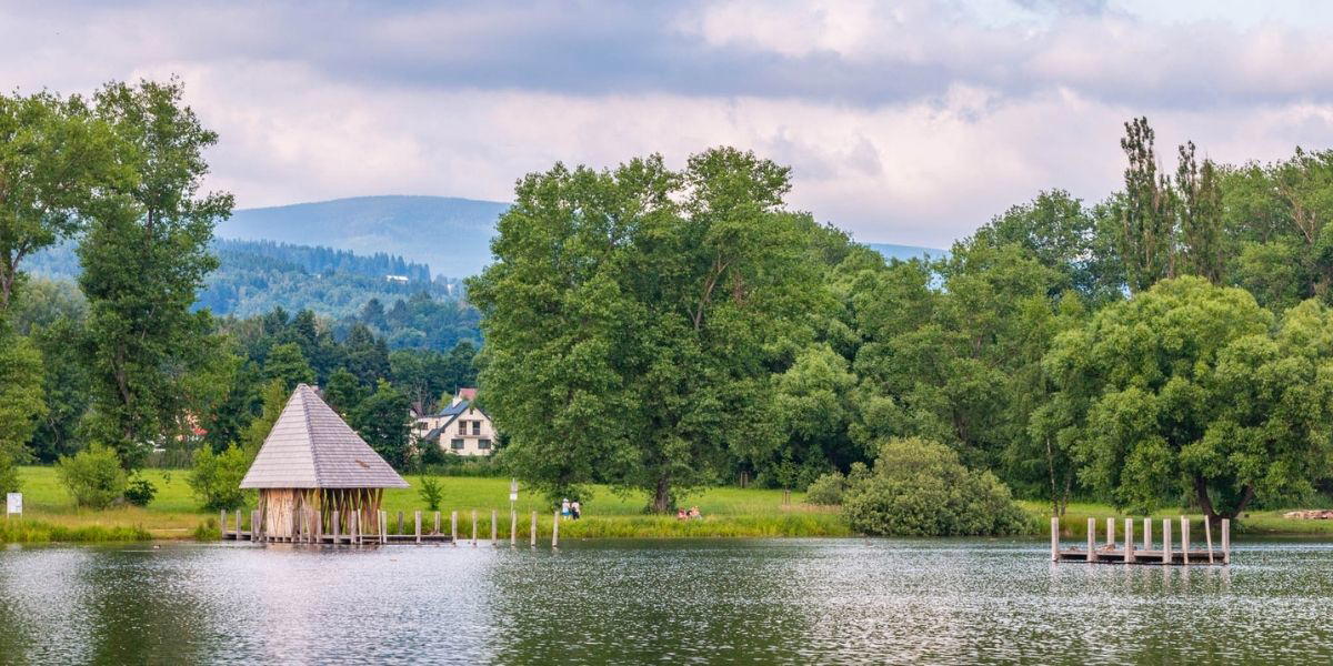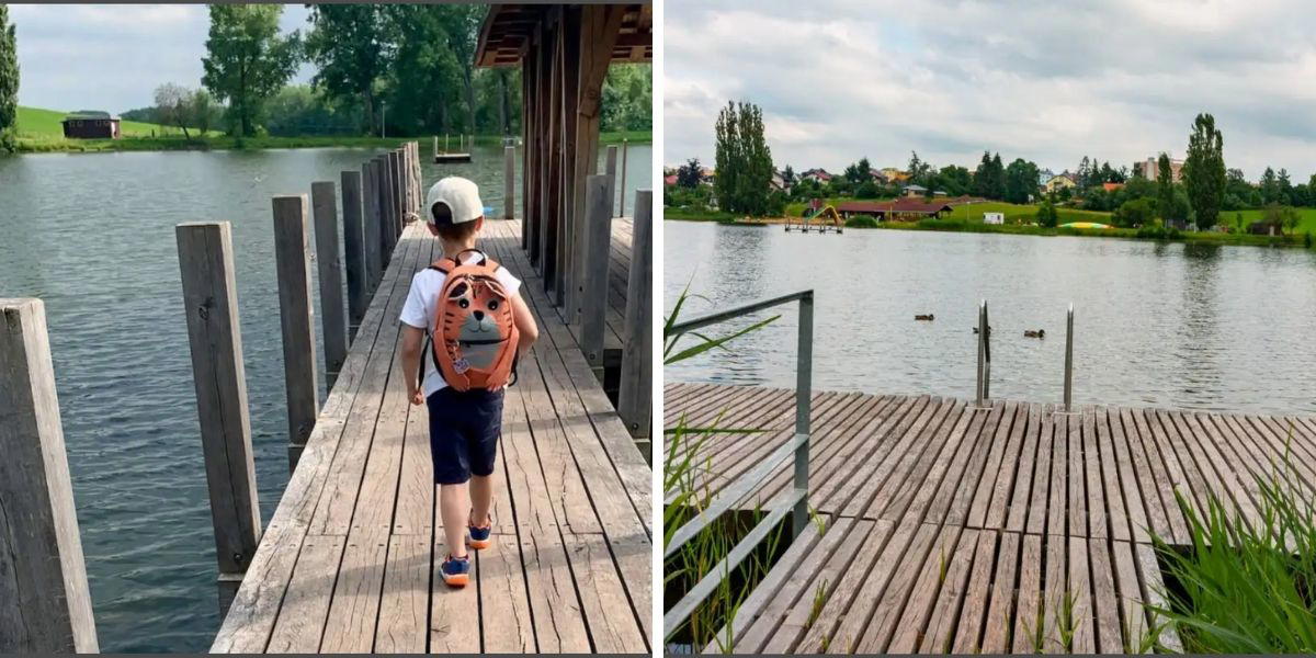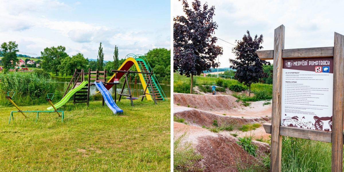 Děti se u rybníka. určitě nudit nebudou ani při teplotě, která koupání nepřeje. Postarají se o to 2 dětská hřiště, pumptrack dráha i u-rampa.