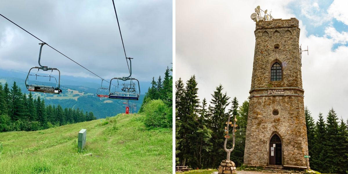 Druhý den jsme se vypravili kousek za Vrchlabí a autem popojeli k sedačkové lanovce na horu Žalý s kamennou rozhlednou.