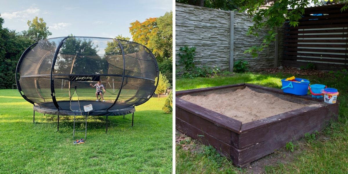 Ovšem, když objevil obří trampolínu v zahradě, tak ta trumfla i LEGO. Menší děti zabaví pískoviště ve stínu stromu.