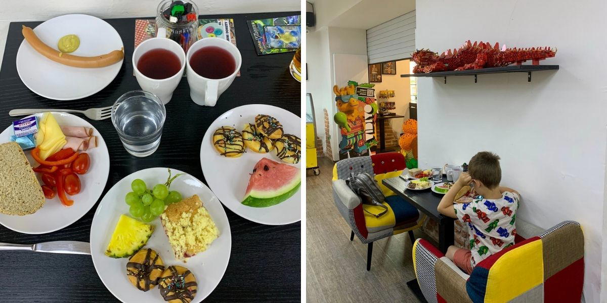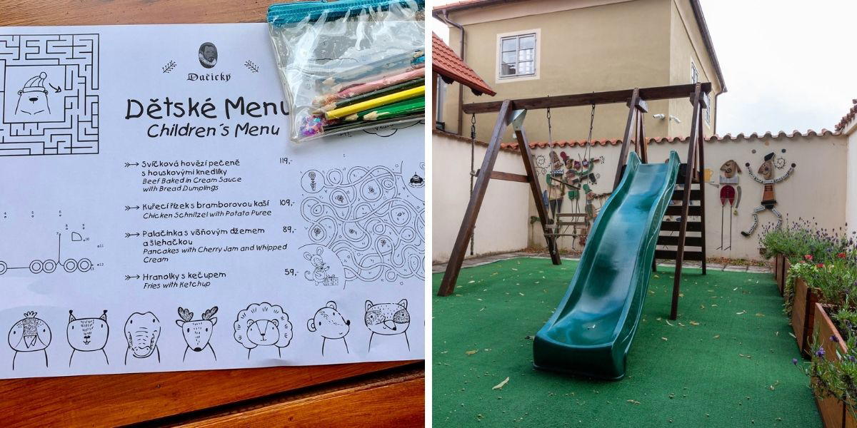 Automaticky nám přinesli dětský lístek s omalovánkami a úkoly i penál s pastelkami. A čekání na oběd zkrátí dětské hřiště.