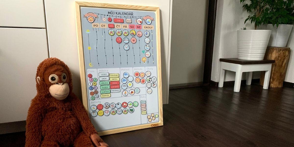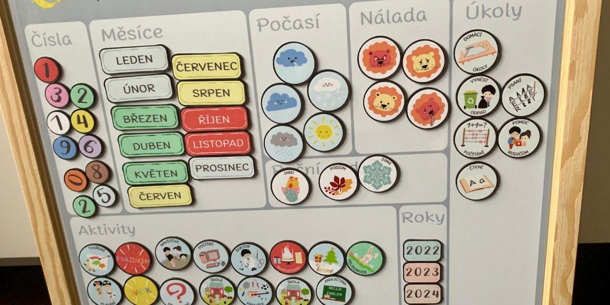 Úplně nahoře si děti nastaví aktuální datum a roční období. Každý den tu mohou zaznamenat, jaké je venku počasí a jakou mají právě náladu. A k jednotlivým dnům už společně s dětmi nastavíte, co je čeká za program a jaké mají úkoly. Splnění úkolů můžete odměnit hvězdičkami. Chybí vám v sadě nějaká aktivita? Dokupovat lze nejrůznější magnetky.