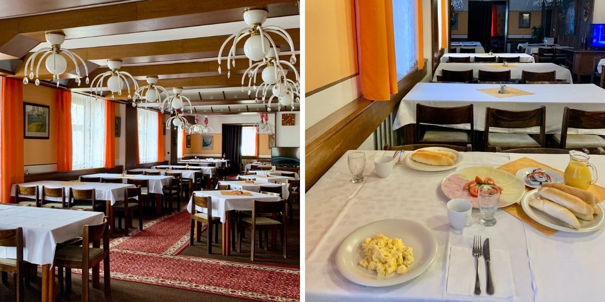 V jídelně naopak z mnoha detailů cítíte původní luxusní reprezentativní sídlo. V ubytování máte zahrnutou snídani. První ráno na nás čekal bufetový stůl, protože v hotelu bylo více hostů. Druhý den byla snídaně kontinentální, kdy jsme na stolech našli čerstvé rohlíky, šunku, sýr, zeleninu, máslíčka, marmelády a pomerančový džus. Po příchodu nám čerstvě připravili míchaná vajíčka a párky.