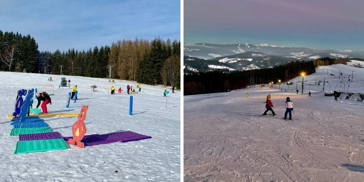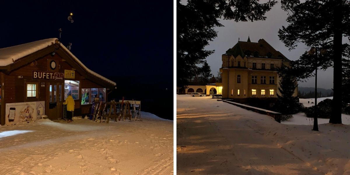 U sjezdovky Větrov jsme využili i večer otevřeného Bufetu U Zdeničky s překvapivě širokým výběrem jídel. Cestu mezi sjezdovkou Větrov a hotelem Kramářova vila už lemuje veřejné osvětlení, takže ani procházky tmou nejsou problém.