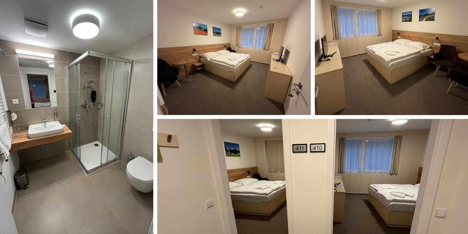 Náš pokoj měl malou předsíňku oddělenou dveřmi od dvou dvoulůžkových pokojů s koupelnami. Což bylo pro naši tříčlennou rodinu víc než štědré a každý z nás měl dostatek soukromí. Spalo se báječně, bylo zde ticho, teploučko, čisto a postele byly dokonalé. Jedinou nevýhodu bych viděla snad jen v tom, že jsme se do wellness i restaurace v hlavní budově museli vždy oblékat do zimních bund.