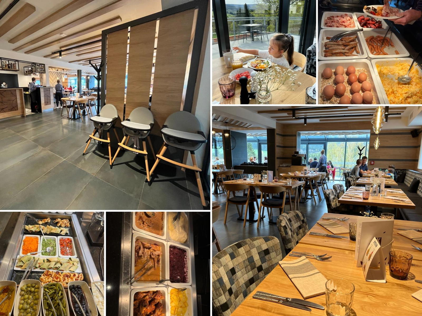 Součástí ubytování je polopenze. Snídaně i večeře jsou formou švédských stolů a výběr je štědrý. Upřímně, ať si dáte cokoli, bude to skvělé. Jednak chutí, ale také díky prostředí. Restaurace s prosklenou terasou totiž nabízí dech beroucí výhledy do okolí.