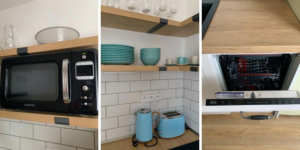 Kuchyň je vybavena skvěle - mikrovlnná trouba, toastovač i myčka nebývají všude úplně standardem. Ale tady ano, nachystaná byla i zásoba tablet do myčky a náhradní sáčky do košů. Odpad se tu třídí, popelnice najdete přímo u domu.