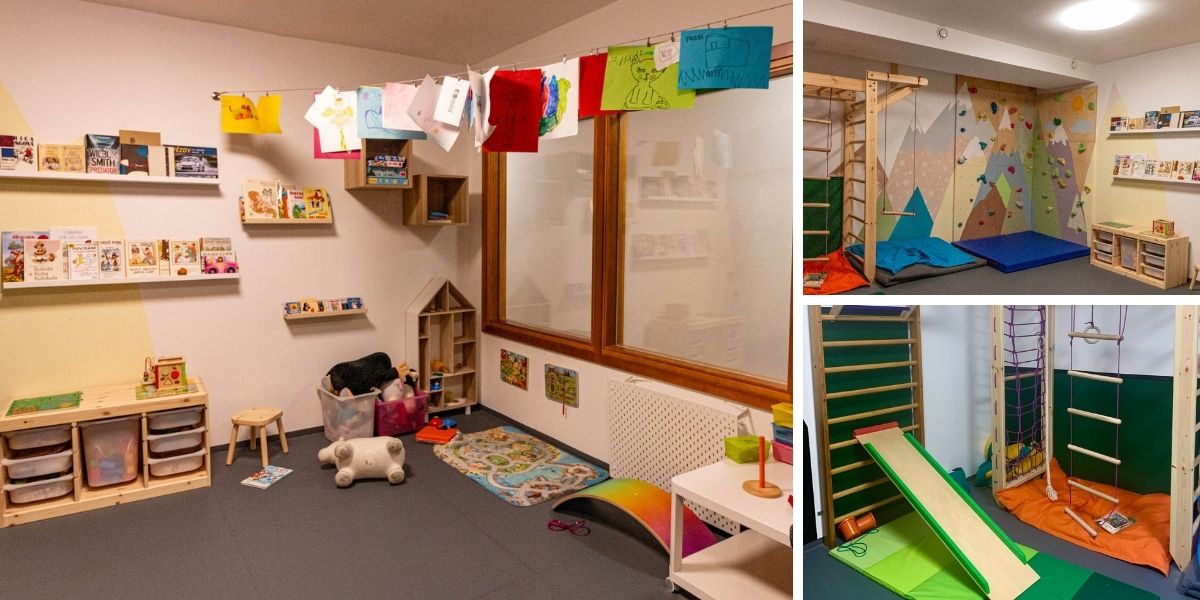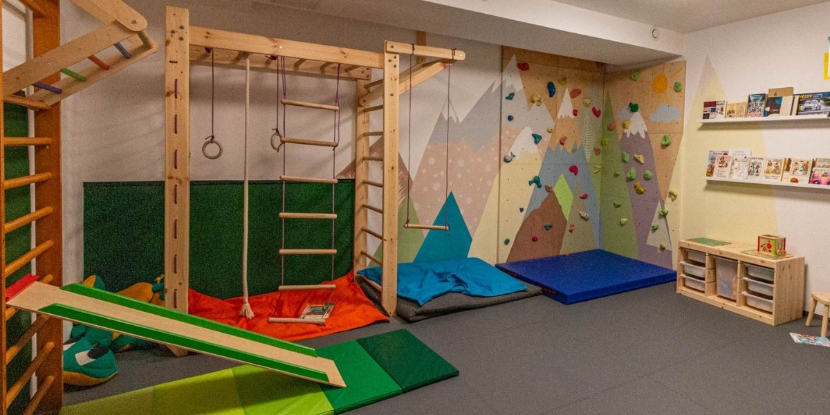Děti ale mnohem víc zajímá místnost pár kroků od sauny - perfektně vybavená dětská herna i s malou horolezeckou stěnou.