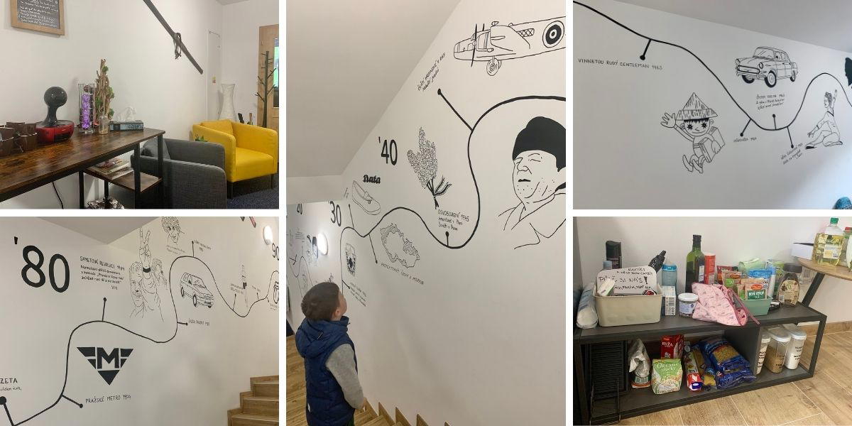 V přízemí najdete také koutek pro přípravy kávy a apartmán '20 proti dětské herně lze v období s nižší obsazeností využívat jako společenskou místnost k posezení se šálkem kávy či hraní společenských her a šipek. Chybí vám při vaření třeba olej nebo rýže? Využijte koutku plného základního vybavení pro vaření i hygienu. A celým domem vás provádí ilustrované české dějiny, určitě se dozvíte něco nového.