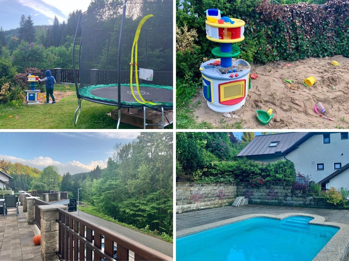 V zahradě si zařádíte na trampolíně, děti zabaví pískoviště a za horkých letních dní se těšte do bazénu.