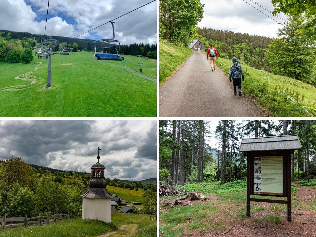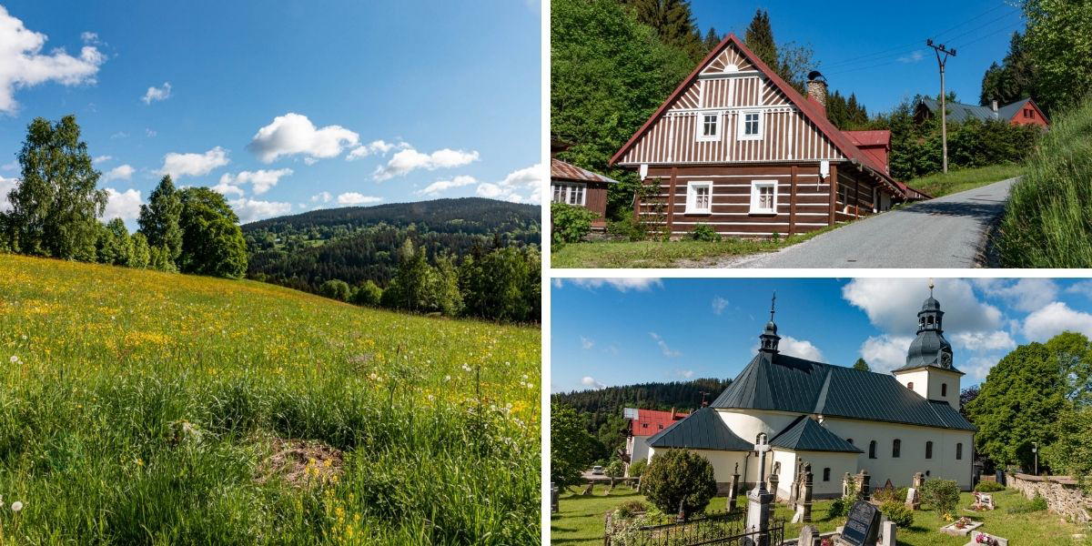 V neděli ráno jsme se zašli podívat do horní části Vítkovic. Od apartmánů se jde 5 minut po silnici ke skiareálu Aldrov a pak už do kopce po žluté trase. Čekají vás malebné roubenky, krásné výhledy a renovovaný kostel.