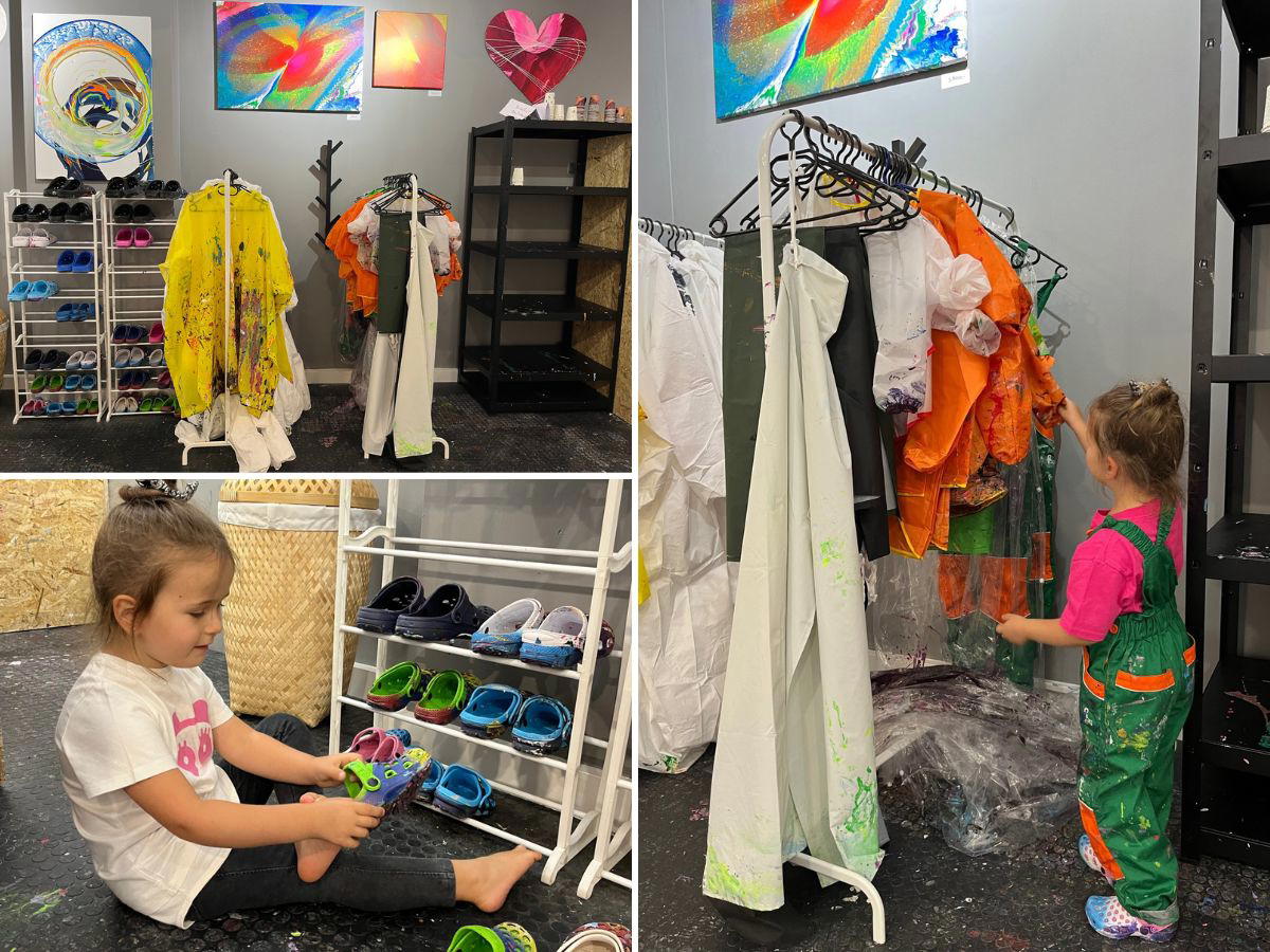 Jako první jsme si oblékli ochranné oblečení i boty. Maluje se totiž akrylovými barvami, které nejdou vyprat, takže bez něj bych patlání barvičkami raději neriskovala. Najdete zde oděvy opravdu všech velikostí.