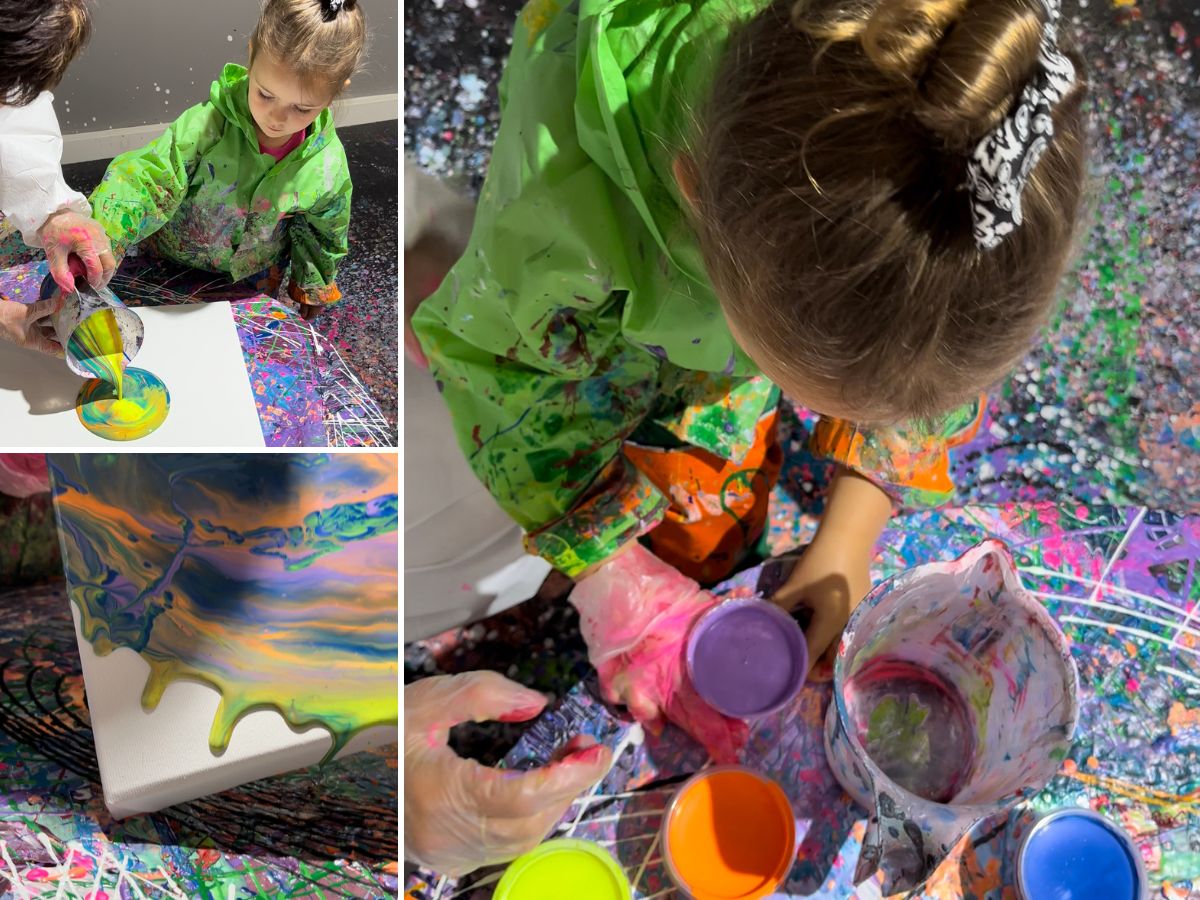 Rozhodli jsme se vyzkoušet také pouring. Podle velikosti plátna si vyberete počet barev. My měli tentokrát plátno 40x40 cm, na což vyšly zhruba 4 kelímky. Barvy si opět zvolila i namixovala dcerka. Poté barvu vylila na plátno a já roztočila stůl. Barva se rozlila do všech stran a vytvořila originální obraz.