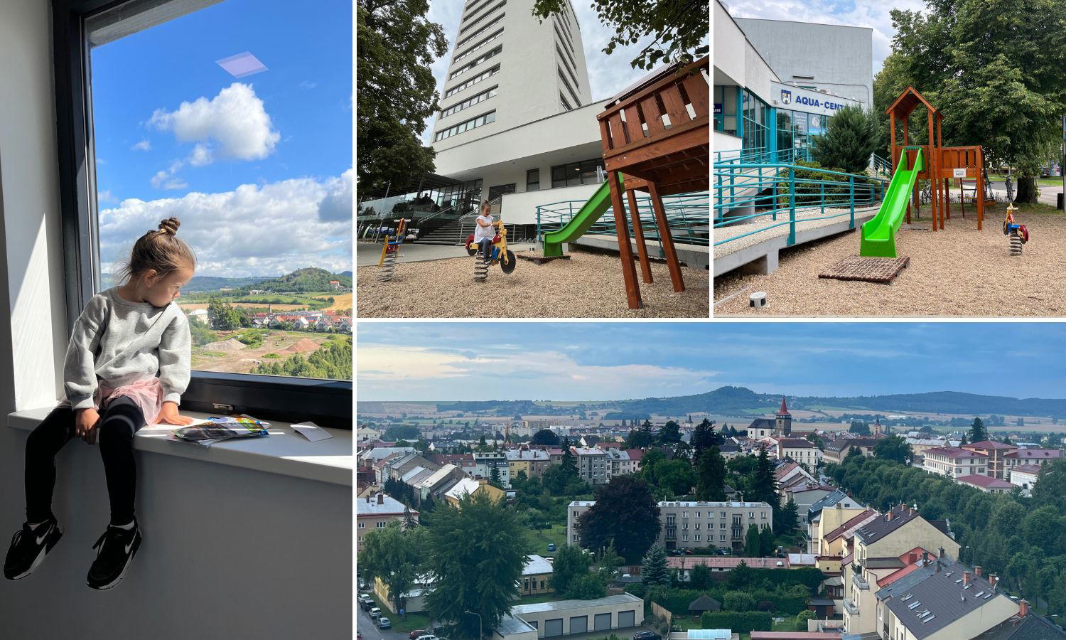 V hotelu si můžete vybrat z jedno nebo dvoulůžkových pokojů, z rodinných pokojů a apartmánů. Pro malé děti vám rádi půjčí postýlku, nočník i stupátko. My dostali prostorný apartmán v 10. patře s božským výhledem na pohádkový Jičín. V koupelně nechyběla dětská kosmetika a dinosauří osuška, ze které měla dcera největší radost.