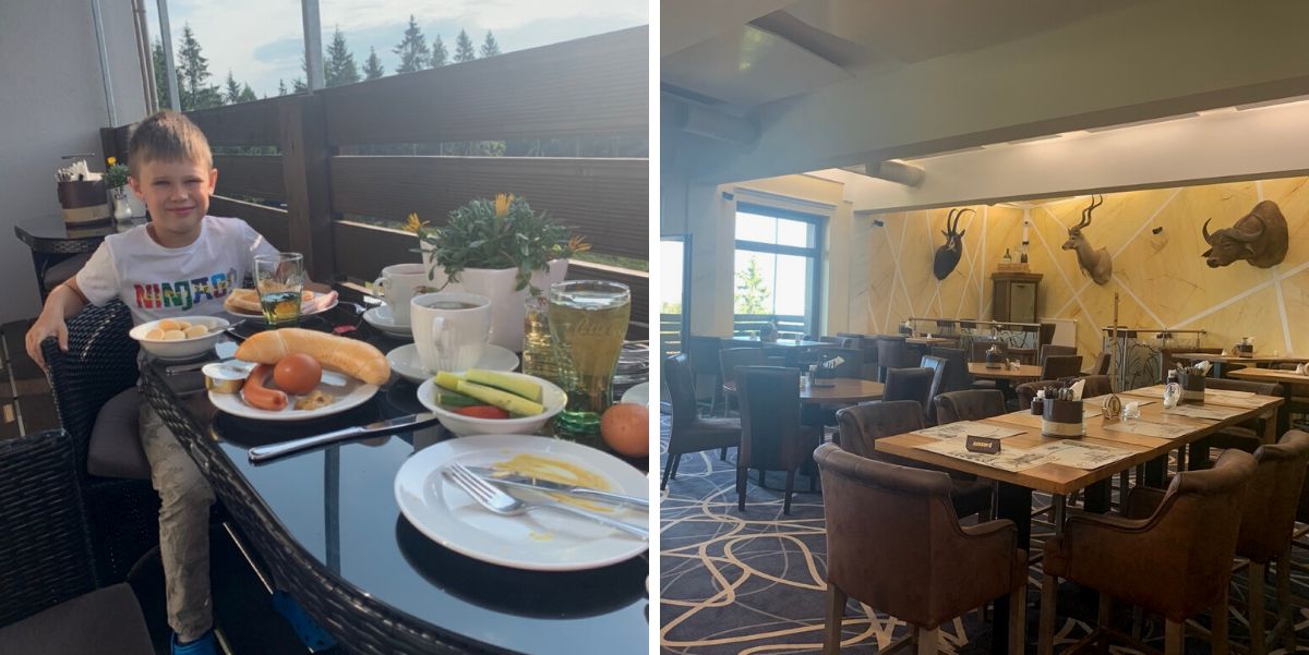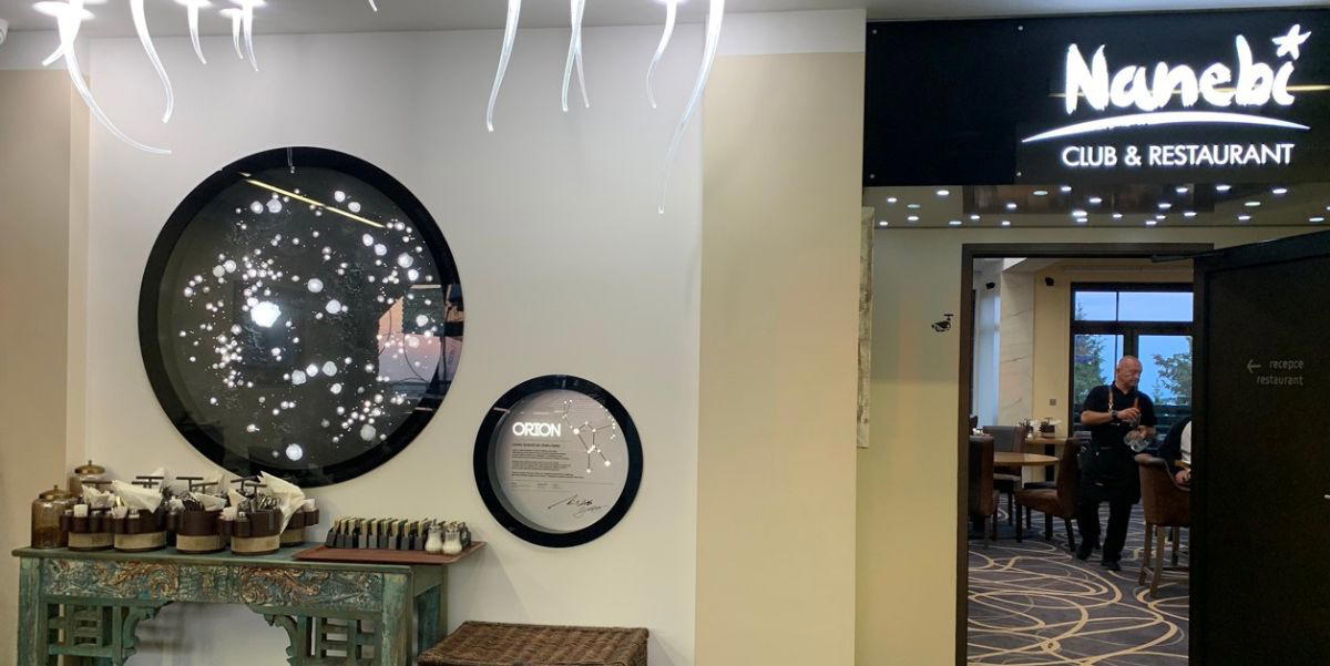 Protože tady jsme opravdu vysoko, nese hotelová restaurace stylově název "Na nebi". Vstup zdobí umělecky zpracované souhvězdí Orion. Oběd byl výborný. Tak moc, že jsme ho přes snědením zapomněli vyfotit.