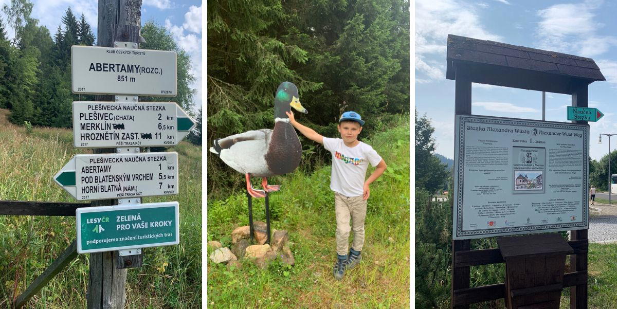 Dál jsme se vydali po značení Plešiveské naučné stezky do Abertam a z nich po žluté do Pstruží, odkud jezdí lanovka na Plešivec i v letní sezóně.