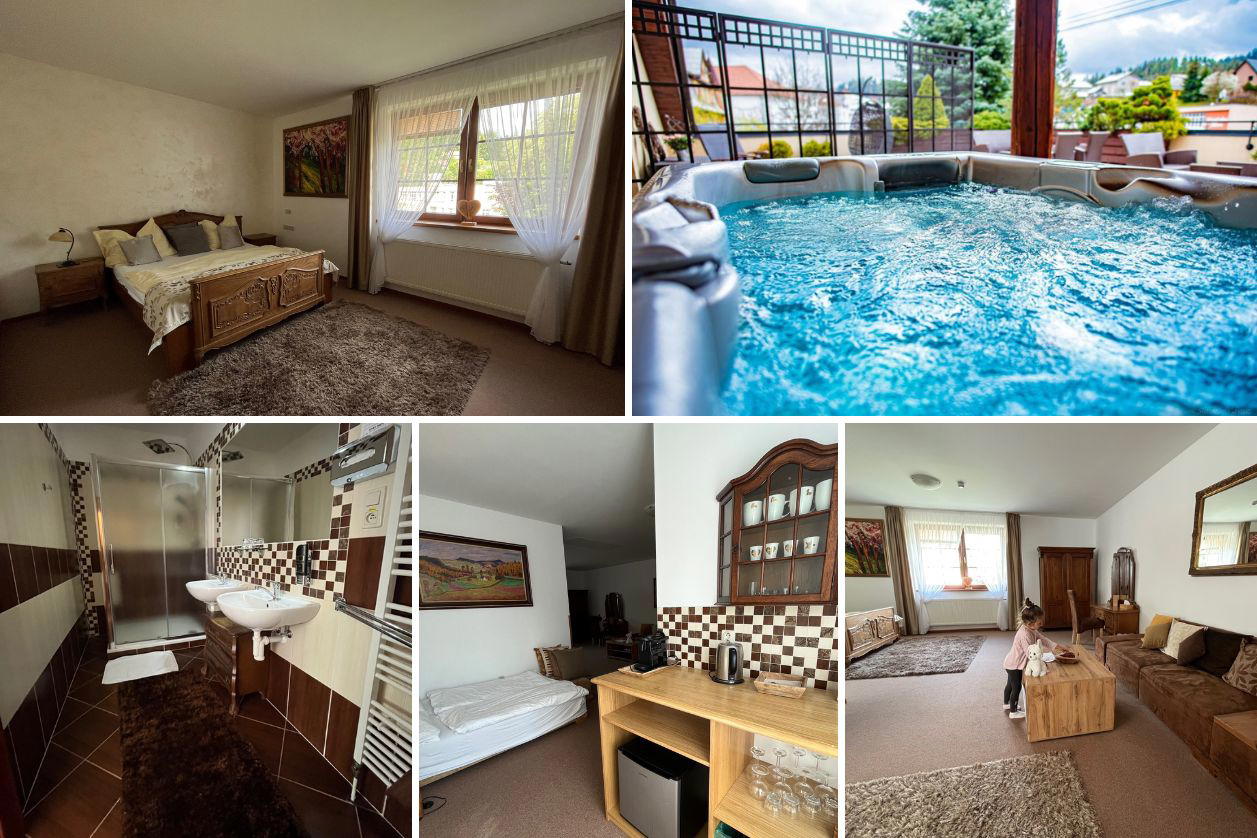 Penzion i restauraci vede už 13 let s láskou velice milá rodina. Budovu tehdy koupili v dezolátním stavu a vlastní pílí ji dokázali zrekonstruovat na krásný a útulný penzion s jedenácti pokoji. My nocovali v rodinném apartmá, což je pro čtyřčlennou rodinu opravdu prostorný pokoj. K dispozici je zde i pokoj s terasou a venkovní vířivkou, kterou můžou mezi 10. a 18. hodinou využívat hosté, od 18 hodin pak už jen hosté z pokoje číslo 5.