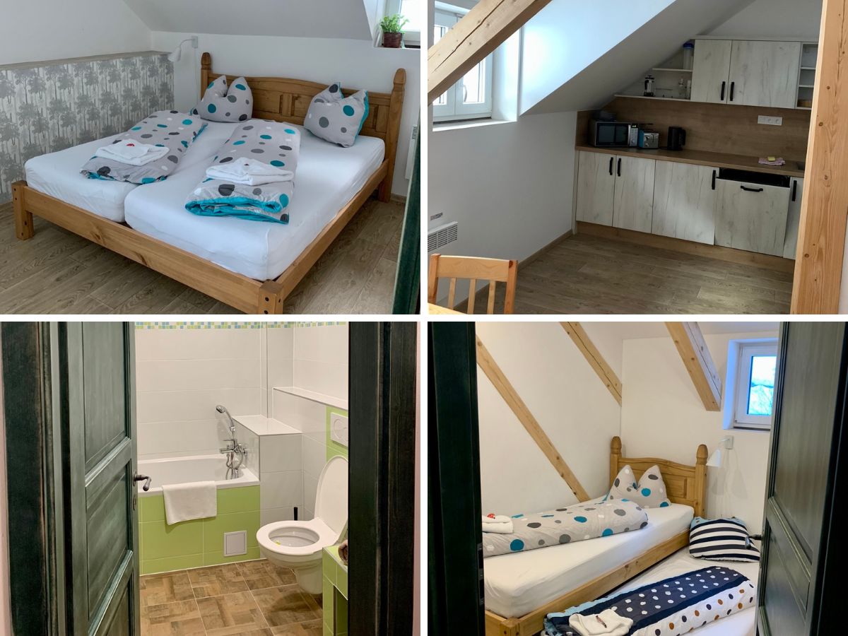 Každý apartmán nese jméno nějaké zajímavosti v okolí, my bydleli v apartmánu č. 5 - Kaskády Velká Desná. Jde o plně vybavený byt s ložnicí s manželskou postelí, pokojíčkem pro děti a obývacím pokojem s kuchyňským koutem a jídelním stolem. Pro nejmenší děti vám připraví postýlku, nočník, redukci na wc i stupátko k umyvadlu.