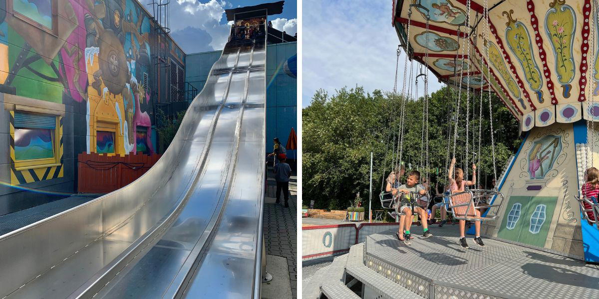 Ve venkovní části čeká opravdu obří skluzavka, kolotoče či nafukovací skákadla.