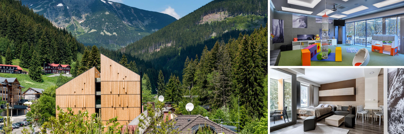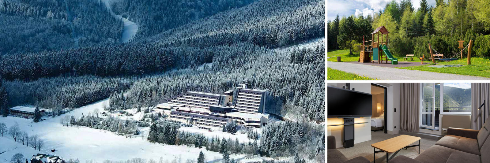 Jen kousek od sjezdovky Labská a zastávky bezplatného skibusu do areálů Svatý Petr, Medvědín či Hromovka objevíte tento moderní hotel s malým wellness centrem, bazénem, dětskou hernou i hřištěm.