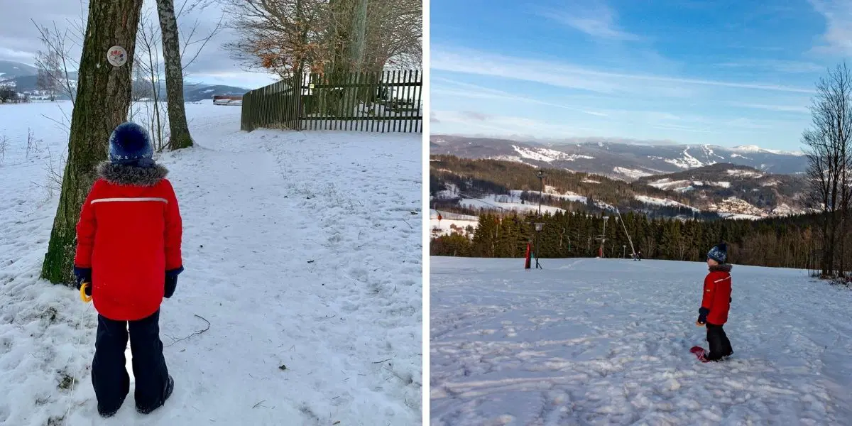 U sjezdovky Větrov jsme využili i večer otevřeného Bufetu U Zdeničky s překvapivě širokým výběrem jídel. Cestu mezi sjezdovkou Větrov a hotelem Kramářova vila už lemuje veřejné osvětlení, takže ani procházky tmou nejsou problém.