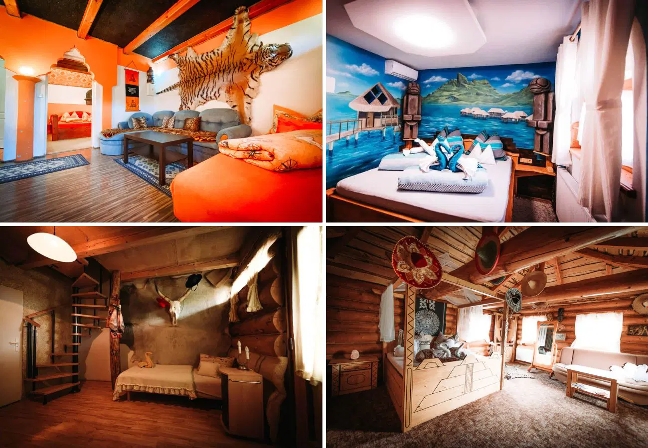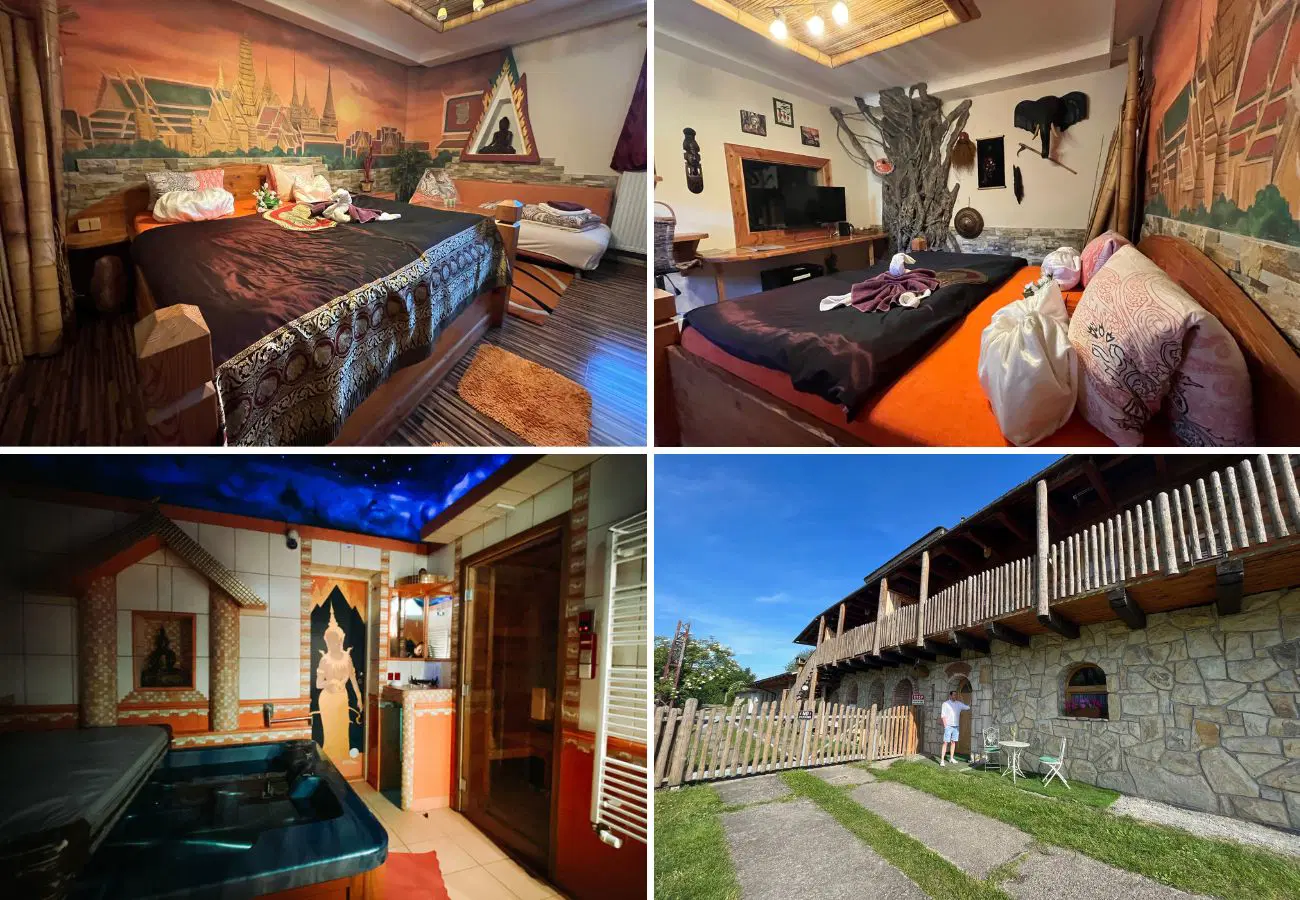 Máte-li rádi neobvyklé ubytování, pak se vám v tomto penzionu bude opravdu líbit. Každý apartmán zde má svůj název podle jiné země a jeho interiér je podle ní také stylizován. V pokoji Egypt tedy čekejte interiér ve tvaru pyramidy, v rodinném pokoji Čína čínskou zeď, v apartmánu Keňa kůže zebry, lvů a antilop a v mezonetu Peru zase malbu Machu Picchu. My se ubytovali v Thajsku, jehož součástí je vířivka a infrasauna. Navíc je v přízemí, takže z pokoje vyjdete přímo ven, kde můžete posedět pod širým nebem a kochat se okolní přírodou.