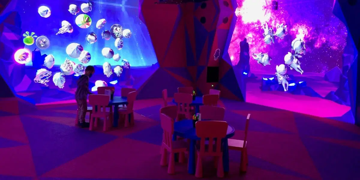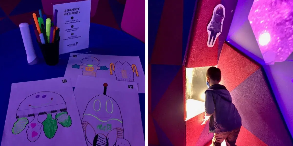 U dětských stolků najdete obrázky a fixy. Po vybarvení obrázek naskenujete a bude se promítat na jedné z interaktivních zdí. Ty jsou tři - s medúzami, s kosmonauty a s vesmírnými raketami. Reagují na dotyk, takže můžete s promítanými obrázky hýbat.