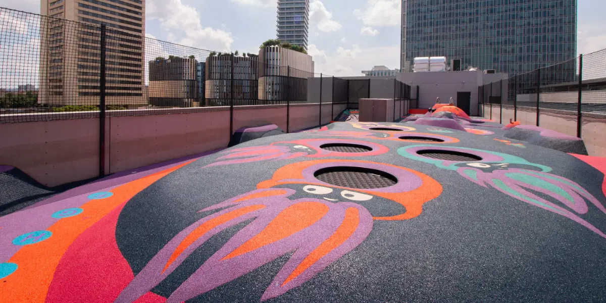 K bistru patří i venkovní terasa a z ní vedou schody na střechu s hřištěm plným trapolín.