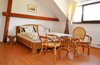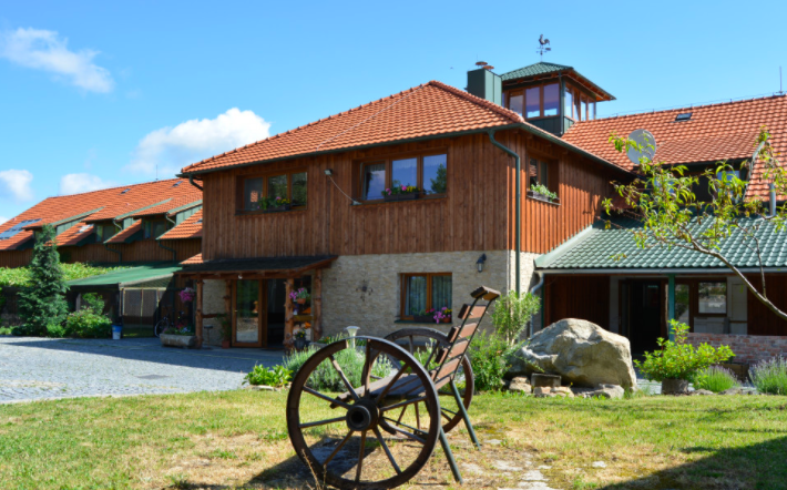 Stylové a moderní ubytování na Ekofarmě. Původně hospodářská budova nabízí jedinečné půdní prostory, ve kterých bylo vybudováno několik komfortních apartmánů a pokojů. Ubytování ma vlastní koupelnu se sprchou a WC. Apartmán pro 6 osob má i vlastní kuchyň. Kapacita ubytování je až pro 35 osob.