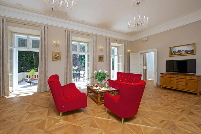 Dopřejte si spánek jako princové, princezny, králové i královny a ubytujte se na zámku v Ratměřicích. Pro rodiny s dětmi tu mají venkovní dětské hřiště i malé brouzdaliště pro neplavce. Maminky i tatínkové si mohou užít nenahraditelné chvíle jen ve dvou, jelikož v hotelu nabízí i hlidání dětí po domluvě za poplatek.